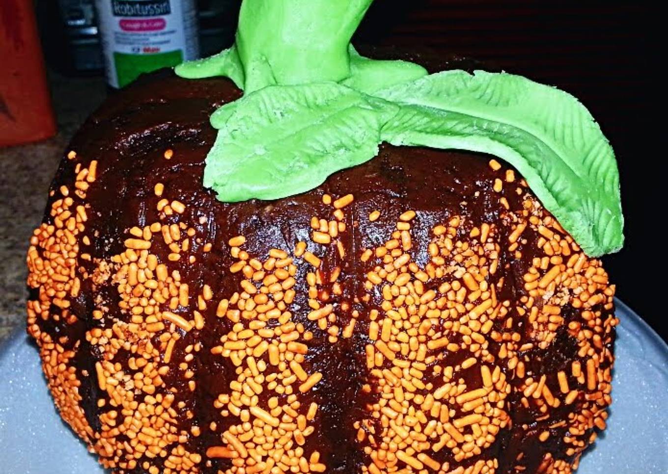 - frost as desired. .I used the ganach heating cream till just comes to a simmer pour over chips stir till combined and smooth & spread in middle to hold together 2 pieces. let set in fridge to firm. reheated same procedure and poured on top of pumpkin, used sprinkles to cover as you like.set in fridge to set