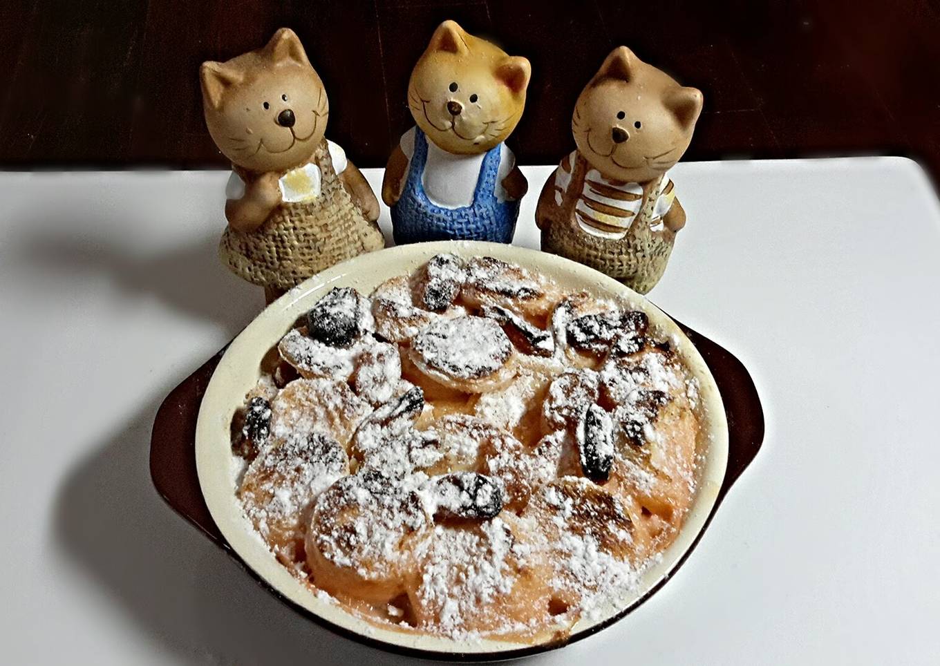 - Top with tiny round bread for decoration ,some raisin (option) ,pour egg mixture,springkle some cinnamon (option)