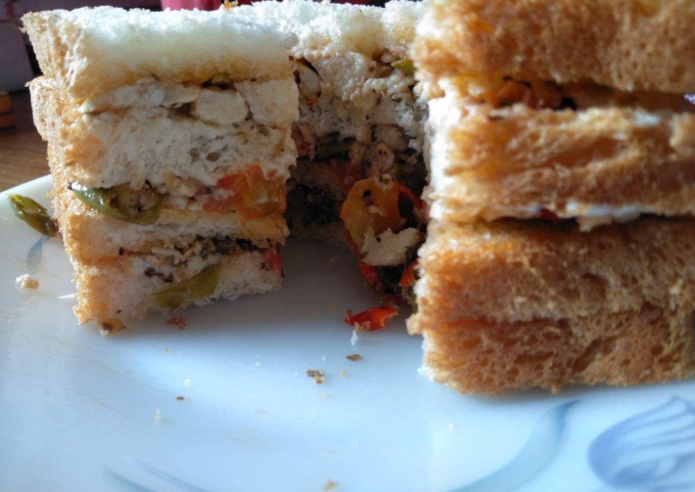 - Take the 4 bread slices and layer it with mayo. Put the mixture of one of the bread then cover it with one bread and again put the mixture on it's top and then cover it with bread. Repeat it once again to get a stack and then cut it into halves.