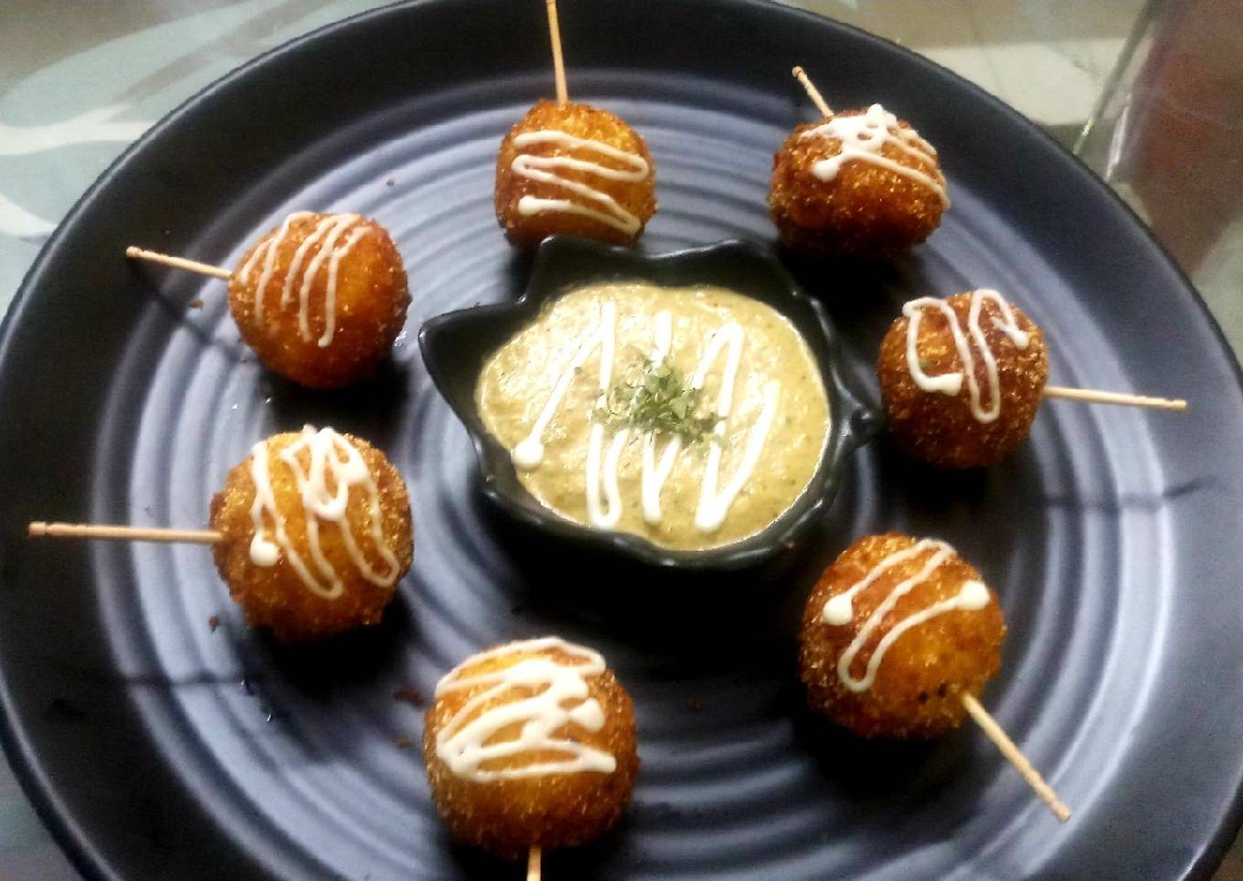 - In meanwhile make a slurry of water and cornflour do not add too much water add little salt,red chilli powder mix it now take a peppery ball and dip in slurry and coat with bread crumbs fry it till it's golden colour Serve with mint chutney and drizzle some mayonise on balls and insert toothpick in it and serve it hot....