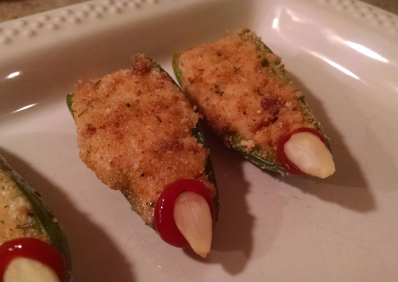 - Let peppers cool for 10 minutes. Dip rounded side of each almond in ketchup and place a pointed tip of pepper to look like a finger nail